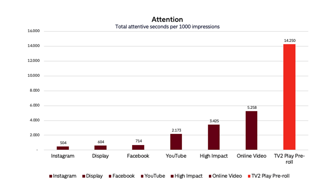 Når du annoncerer på TV 2, bliver dit brand ikke bare bemærket - det bliver husket. Budskaber huskes først efter 2,5 sekunders aktiv opmærksomhed. Jo flere sekunder med aktiv opmærksomhed, jo større chance for at dit brand huskes i købssituationen.