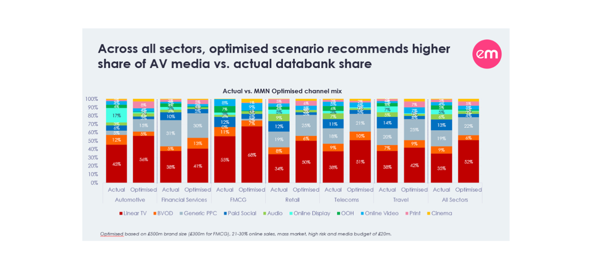 I grafikken nedenfor er den aktuelle fordeling sat overfor den optimale fordeling af annoncørernes medieinvestering i seks brancher: Biler, Finans, FMCG, Retail, Tele og Rejser. Yderst til højre kan man se den totale fordeling af medieinvesteringerne på tværs af kategorier sat i forhold til den optimale medieinvestering, der optimerer forbedrer salget.