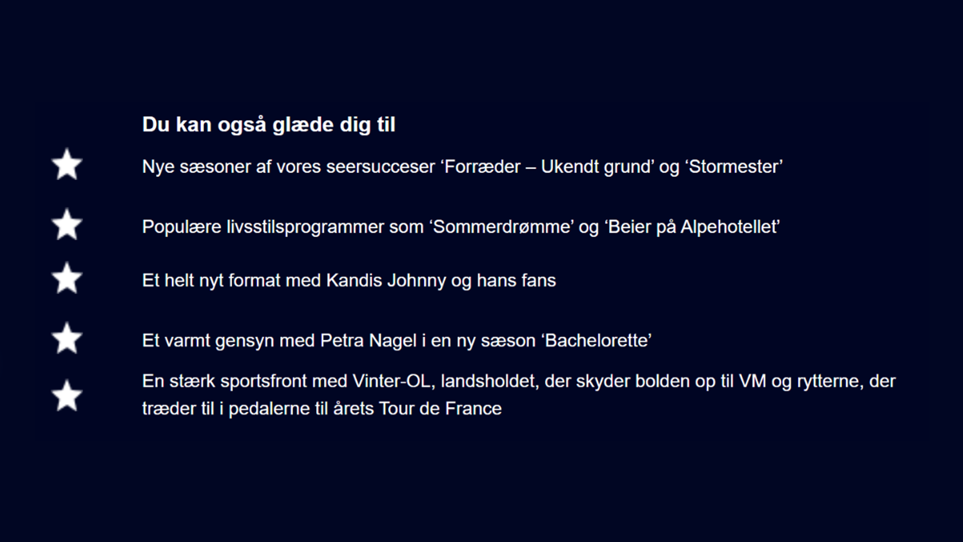 Programplanen for første halvår 2026 byder både på nye og velkendte formater. Glæd dig til spændingsfyldt underholdning og fiktion, relaterbare livsstilsprogrammer, dragende kærlighedsfortællinger, medrivende reality og en sportssommer, der vil samle danskerne.