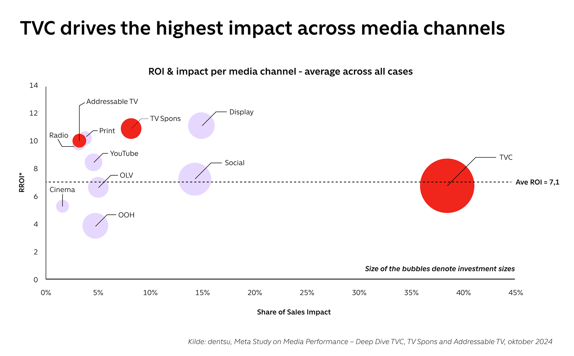 Det tydeliggøres i dentsus omfattende 'Meta Study on media performance - deep dive TVC, TV Spons and Addressable TV' fra oktober 2024, der blandt andet belyser mediekanalers ROI på kortsigtet salg i Danmark.