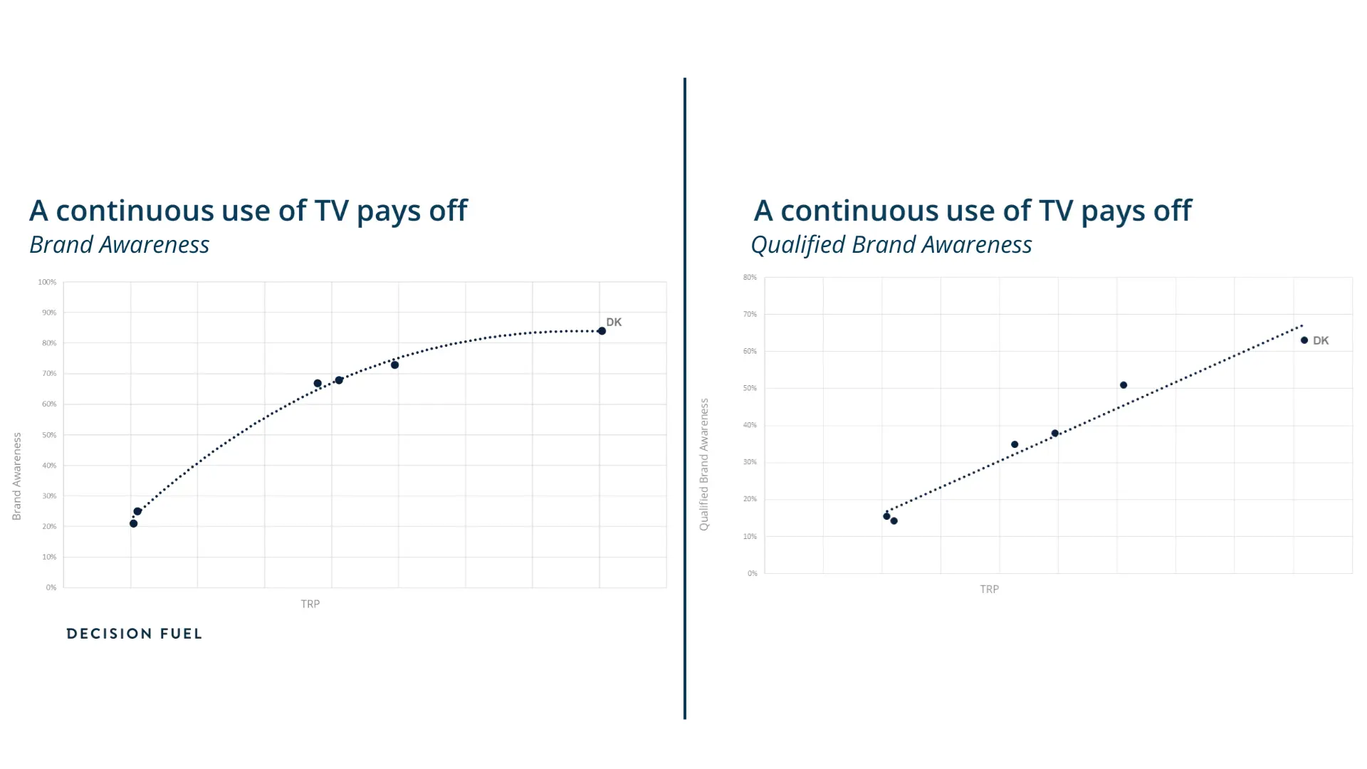 Casen viser uddybende, at tv er uundværlig for at opbygge det kendskab, der skal til for - på den mest kost-effektive måde - at styrke brand awareness og dermed øge virksomhedens markedspenetration. En høj markedspenetration er fordelagtigt, da det i følge casen fører til øget kundeloyalitet. Med andre ord - jo flere der kender dit brand, jo flere kunder får du og jo højere købsfrekvens per kunde kan din virksomhed opnå. Dette kan ses på grafen nedenfor, hvor hver prik er et marked med Danmark øverst.