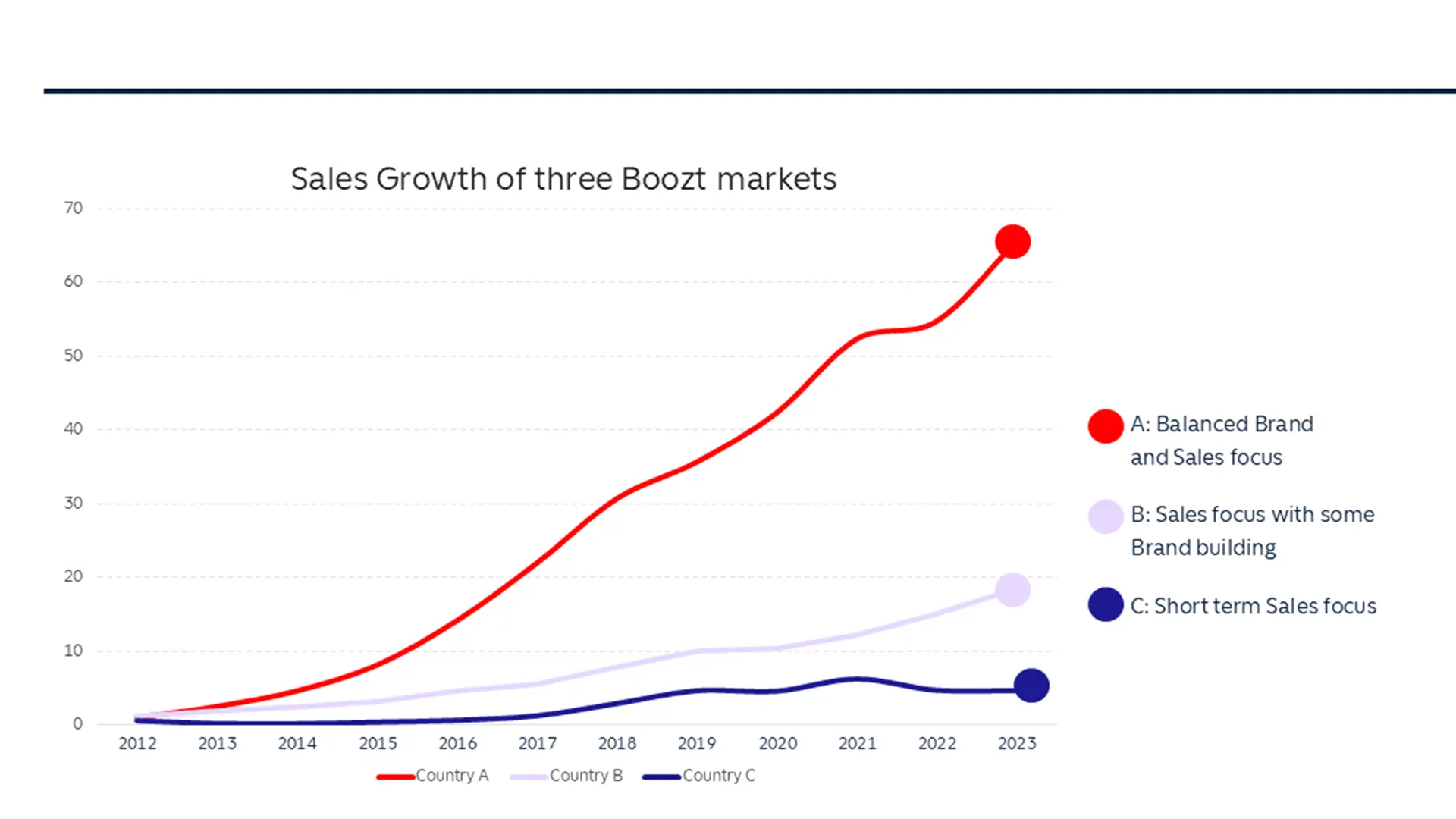 På markeder med stærk og vedvarende tv-tilstedeværelse og dermed en korrekt balance mellem branding og kortsigtet salgsfokus, har salgsvæksten været markant højere - som nedenstående graf med tre Boozt markeder tydeligt viser.