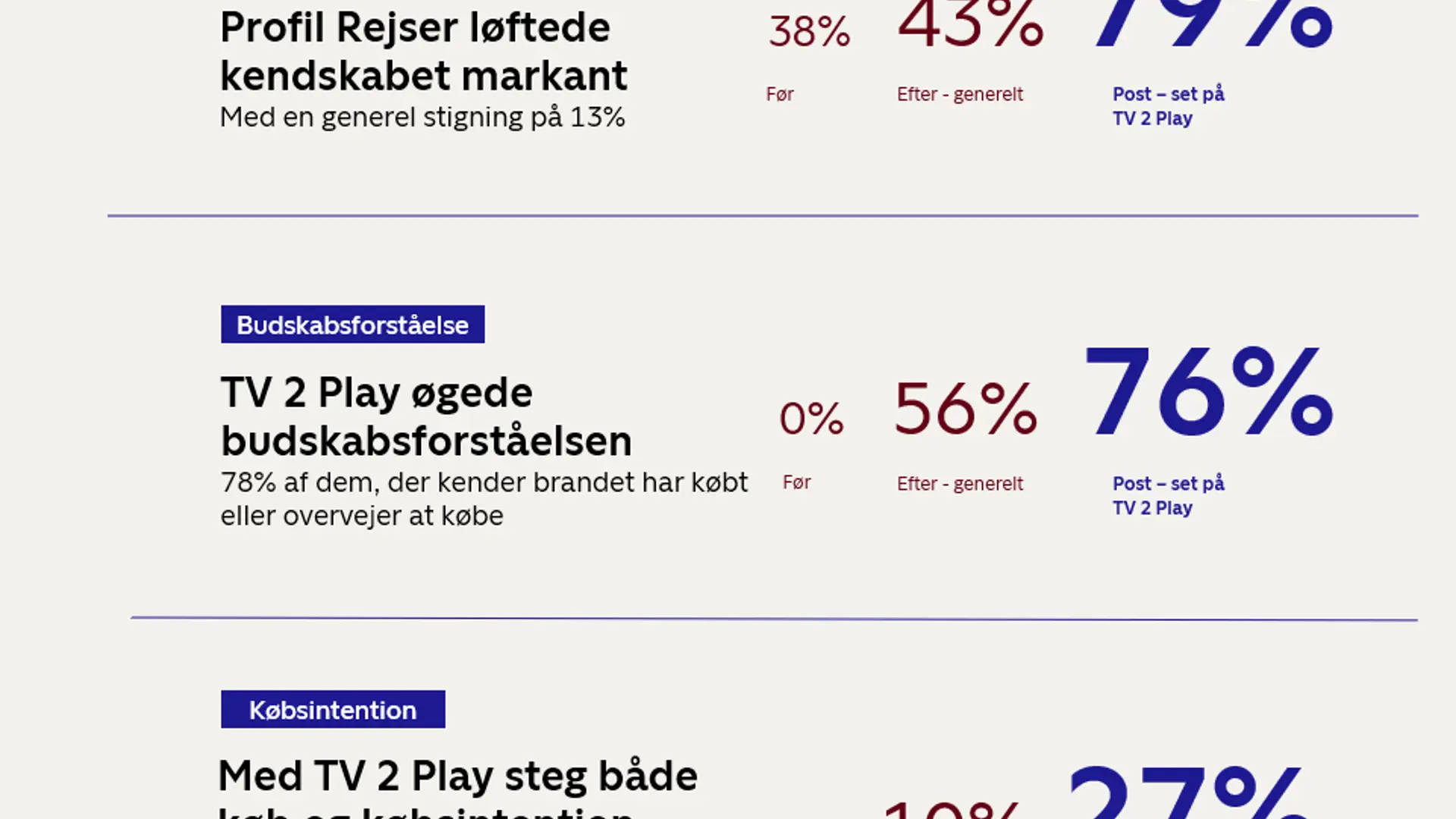 TV 2 Play leverede bred eksponering i en kvalitetskontekst, der smittede af på brandet og styrkede budskabsforståelsen. Målgruppens forventninger blev mødt og købsintentionen blev boostet markant.